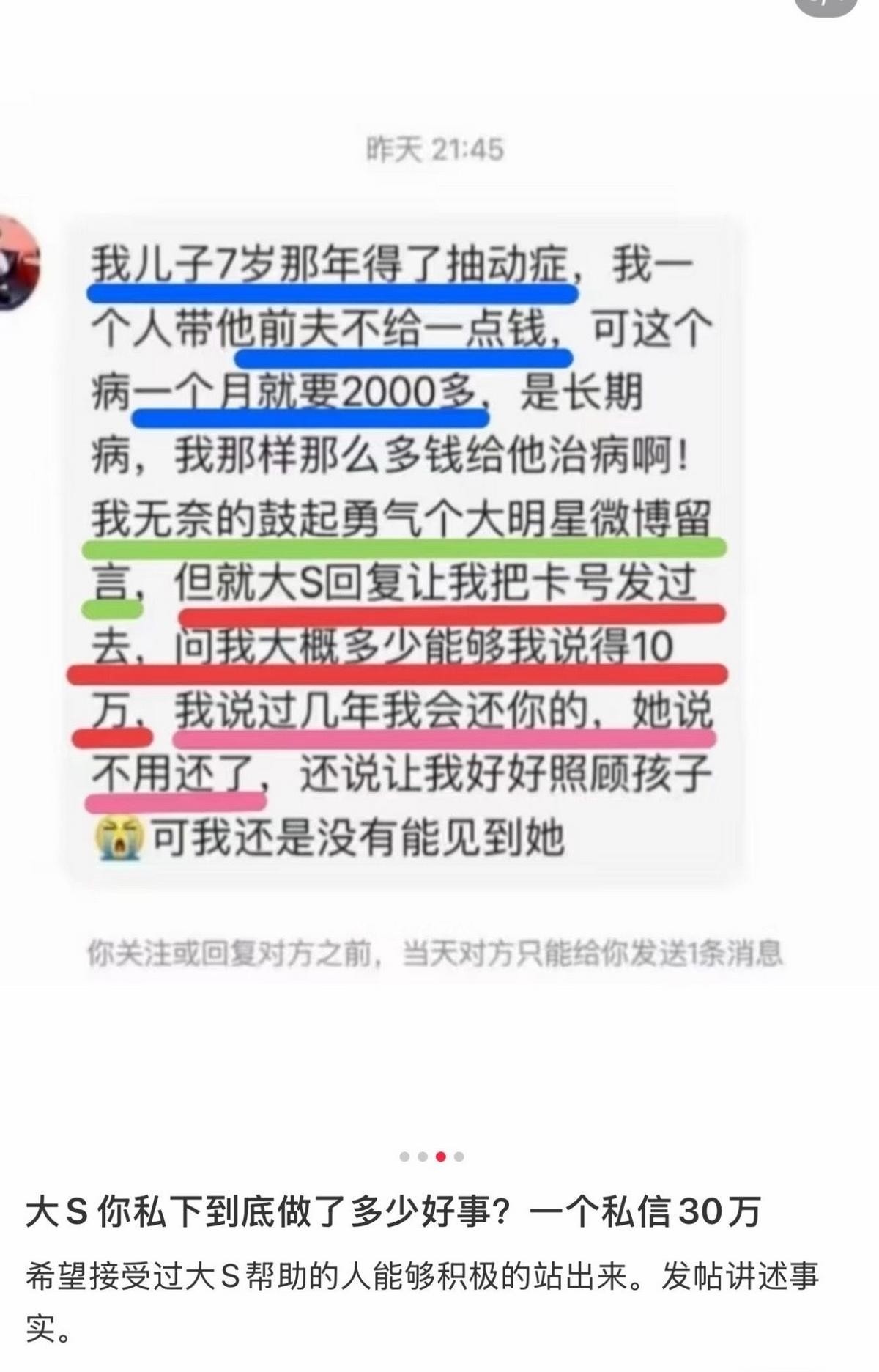 最终,只有大S给予了回应,并直接打来10万元支援。对方提出要写借条、承诺归还,却被大S婉拒:“不用还,你把孩子照顾好就够了。”